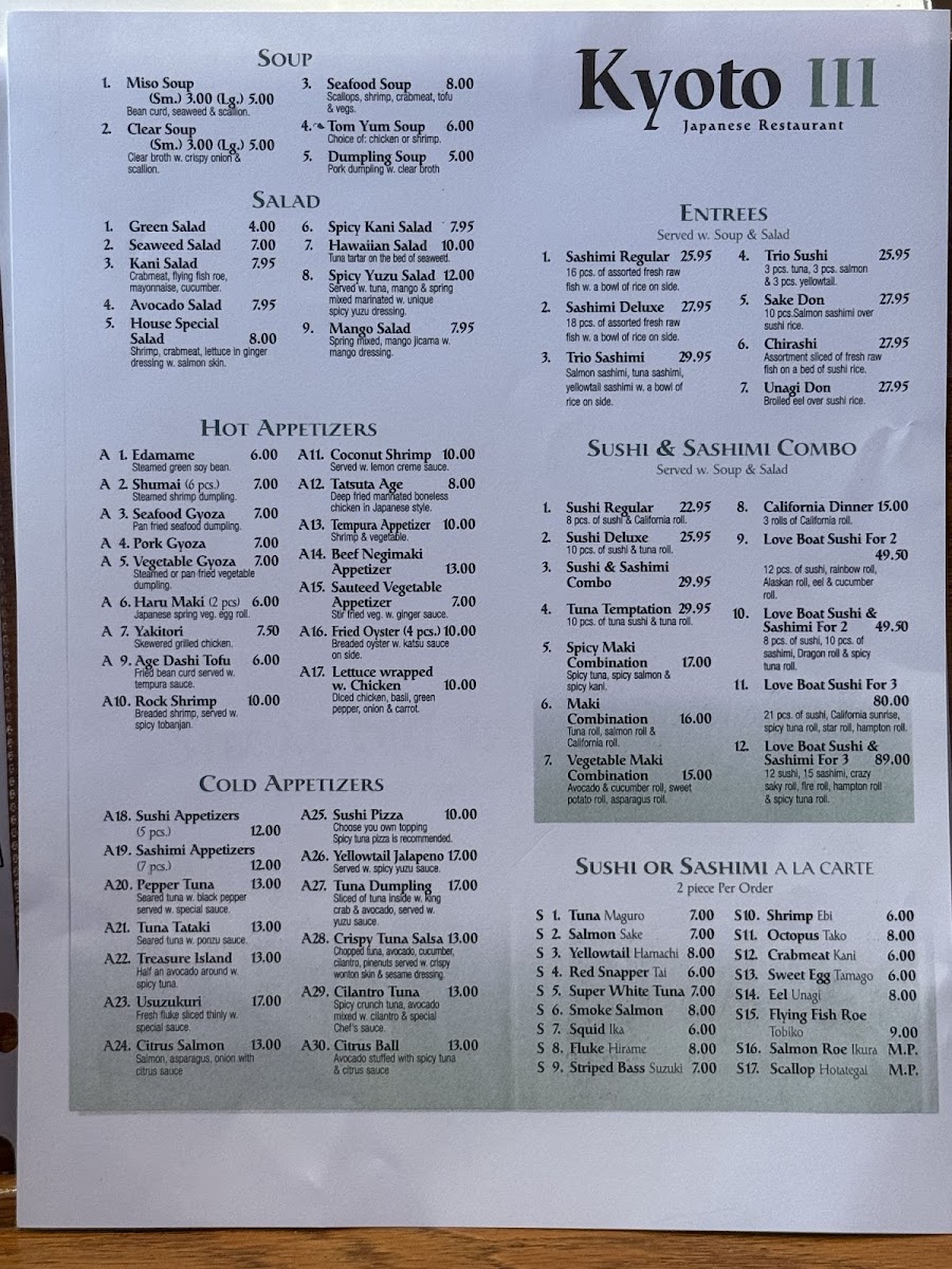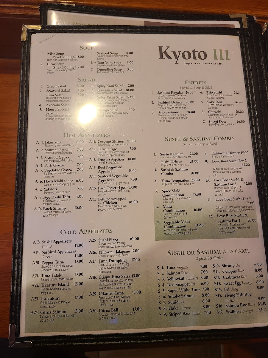 For those who prefer cooked fish options, Kyoto Sushi III excels with dishes tailored to taste and dietary preferences, ensuring that everyone can enjoy a delightful meal. The cozy atmosphere and warm, welcoming staff enhance the dining experience, creating a friendly vibe where guests feel at home. If you're looking for a place to savor high-quality sushi while feeling like part of the family, Kyoto Sushi III is a destination worth visiting!